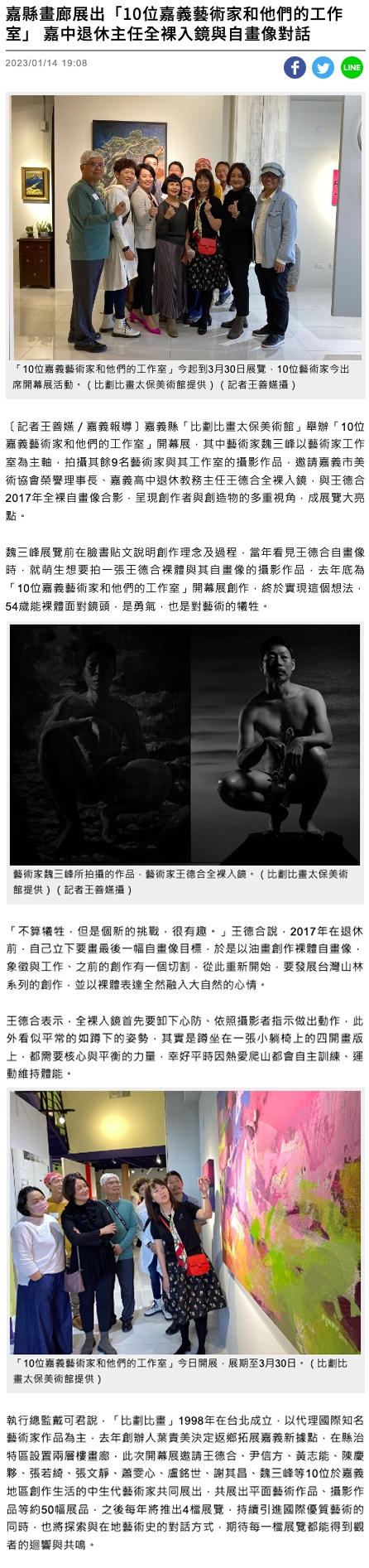 〔記者王善嬿/嘉義報導〕嘉義縣「比劃比畫太保美術館」舉辦「10位嘉義藝術家和他們的工作室」開幕展,其中藝術家魏三峰以藝術家工作室為主軸,拍攝其餘9名藝術家與其工作室的攝影作品,邀請嘉義市美術協會榮譽理事長、嘉義高中退休教務主任王德合全裸入鏡,與王德合2017年全裸自畫像合影,呈現創作者與創造物的多重視角,成展覽大亮點。 魏三峰展覽前在臉書貼文說明創作理念及過程,當年看見王德合自畫像時,就萌生想要拍一張王德合裸體與其自畫像的攝影作品,去年底為「10位嘉義藝術家和他們的工作室」開幕展創作,終於實現這個想法,54歲能裸體面對鏡頭,是勇氣,也是對藝術的犧牲。