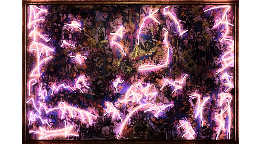 SenatrA has, in recent years, cultivated a style evocative of medical imaging – especially cardiograms. Electrocardiography is a diagnostic method that measures the heart’s electrical activity: the so-called cardiac action potential is recorded by electrodes, as a series of upward and downward spikes, in a wave-like pattern. SenatrA’s artistic autograph resembles this up and down motion, inscribed in curved lines, sharp corners and jagged edges, arranged in irregular rhythms, highs and lows, gentle waves and precipitous jumps. The painter allows the paint to flow over the canvas like magma, cloaking the stasis of her medium in a metaphor of reality. Dynamic brushstrokes and well-conducted lines, from strong to fine, wander up and down the pictorial ground, occasionally blazing almost-meticulous trails through that which is already gathered and scattered. Webs of lines condense to pastose textures, producing a dense tapestry of sensation. Hard contrasts between black and white, subtle transitions and monochrome islands of colour represent the basis of a style of painting that reflects stirrings of emotion and moods: Here the ephemerally sensed – there the vehemently felt. SenatrA’s works also act as notations of time, capturing the fleeting nature of the moment, in defiance of the stasis of the non-living. The lightness of such painting is decidedly not due to a lack of emotional depth – on the contrary, it is owed to the nimbleness of SenatrA’s creative process and a proclivity for graphic depiction. Some of her recent works are enhanced with strips of neon light, accentuating relationships and discursive structures in line with French critic Nicolas Bourriaud’s relational aesthetics, formulated in the late 1990s. Bourriaud did not view contemporary artists as solitary beings safeguarding an independent, private space – rather, he saw in them catalysts within a social edifice and a decentralised network.